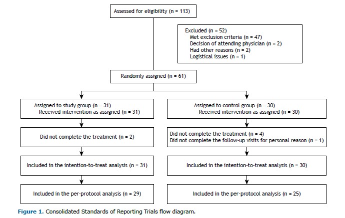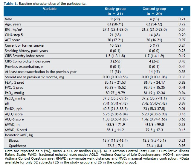 RESULTS We evaluated 61 participants, 31 in the SG and 30 in the CG. Although all participants were included in the intention-to-treat analysis, 7 were excluded from the per-protocol analysis (Figure 1). As shown in Table 1, there were no significant differences between the two groups in terms of the demographic, anthropometric, physiological, or clinical characteristics, or in terms of the medications used. The only statistically significant difference was in the FeNO, which was higher in the SG. In addition, none of the enrolled subjects had any clinically significant respiratory conditions other than asthma.