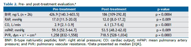 Other key findings in our study include improvements in functional class and BNP levels, which are consistent with those of other studies.(11,12) One of the aforementioned studies(11) showed a 622 ng/L reduction in N-terminal pro-BNP levels, whereas the other(12) showed a 291 ng/L reduction, both being consistent with our observed improvements in BNP levels and functional class.(11,12)