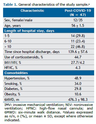 During the COVID-19 pandemic, critically ill patients frequently required ICU admission, oxygen therapy, and mechanical ventilation, often resulting in complications related to comorbidities and prolonged hospitalization. Vascular alterations, chronic/acute inflammation, and worsening of preexisting conditions have been associated with poor outcomes.(1,2) Patients presenting with any of the aforementioned conditions commonly experience functional decline, muscle loss, ICU-acquired weakness, and reduced independence.(3) In patients with COVID-19, complications such as microthrombi, thromboembolic events, epithelial damage, and elevated proinflammatory cytokines are prevalent, and the dysregulated inflammatory response can lead to vasculitis, coagulation disorders, and impaired gas exchange caused by altered capillary blood flow.(4) Evidence suggests that vascular dysfunction as assessed by near-infrared spectroscopy (NIRS) and vascular occlusion testing (VOT) is associated with endothelial damage, more severe ARDS, and increased mortality.(5) When associated with submaximal tests such as the six-minute walk test (6MWT), NIRS can aid in assessing musculoskeletal, vascular, and pulmonary responses in post-COVID-19 patients, revealing potential associations between cardiovascular and microvascular dysfunction.(6) We sought to evaluate vascular reactivity in post-COVID-19 patients using VOT and to explore the correlation of VOT with the 6MWT and handgrip strength (HGS). This was a prospective observational study conducted at the outpatient clinic of the Universidade Estadual de Campinas Hospital de Clínicas, located in the city of Campinas, Brazil. The study was approved by the local research ethics committee (Protocol no. CAAE 34454920.7.0000.5404). Between February and December of 2022, individuals > 18 years of age discharged after RT-PCR-confirmed COVID-19 pneumonia and referred to the post-COVID-19 outpatient clinic were invited by telephone to undergo functional and vascular assessments at our physical therapy and occupational therapy service. Exclusion criteria included upper limb injuries preventing NIRS sensor placement, inability to perform the 6MWT, and cognitive impairment interfering with test understanding. Each participant underwent a single evaluation session including the following: vascular reactivity assessment via NIRS and VOT; HGS testing with a hydraulic dynamometer (Saehan Corporation, Changwon, South Korea); and the 6MWT, performed in a 30-m corridor in accordance with the American Thoracic Society guidelines.(7) The six-minute walk distance (6MWD) was compared with reference equations for the 6MWT in healthy individuals in Brazil.(7)