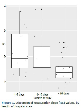 Patients who had been hospitalized for more than 10 days had significantly lower resaturation slope values (1.47 ± 0.51 %/s) than those who had been hospitalized for 1-5 days or 6-10 days (p = 0.02), reinforcing the hypothesis that prolonged hospitalization is associated with impaired microvascular reactivity (Figure 1). Although the functional consequences were not evident in the short term, these findings may indicate long-term risks related to endothelial dysfunction.(8,9) The need for further prospective studies remains critical to clarify the clinical implications of these microcirculatory alterations.