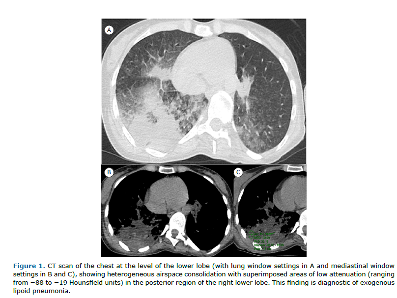 3. Marchiori E, Zanetti G, Mano CM, Irion KL, Daltro PA, Hochhegger B. Lipoid pneumonia in 53 patients following aspiration of mineral oil. Comparison of HRCT findings in adults and children. J Comput Assist Tomogr. 2010;34(1):9-12. https://doi.org/10.1097/RCT.0b013e3181a9ec9f