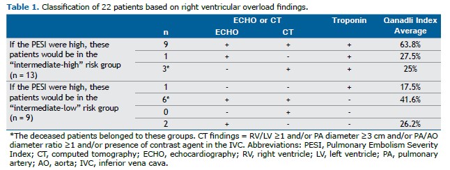 In the present study, patients with <86 points on the PESI (i.e., Class I or II, defined as low risk) were assessed for radiologic and echocardiographic signs of RVD.(4) On chest CT, the following findings were considered markers of RVD: pulmonary artery/aorta diameter ratio ≥1, pulmonary artery diameter ≥3 cm, presence of contrast material in the inferior vena cava (IVC), and right ventricular/left ventricular diameter ratio ≥1.(3) Echocardiographic markers included RV dilation (RV/LV ratio >1), RV hypokinesia, interventricular septal flattening, elevated systolic pulmonary artery pressure, and a dilated IVC with diminished respiratory collapse.(3)