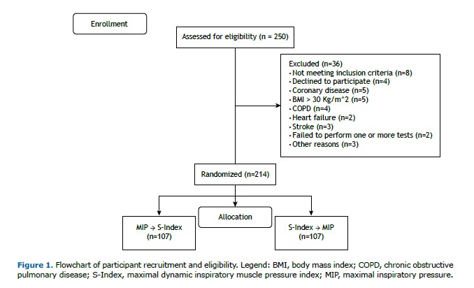 All participants were randomly assigned to the sequence of assessment procedures using a six-sided die. Rolls of 1, 2, or 3 indicated that the participant would begin with static maximal respiratory pressure measurements (MIP and MEP) first, followed by dynamic maneuvers, while rolls of 4, 5, or 6 began with dynamic inspiratory muscle pressure (S-Index) measurements followed by static maneuvers.