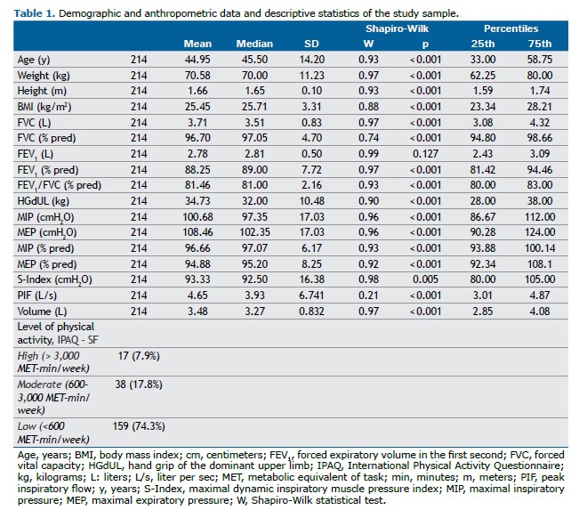 RESULTS Among the 250 volunteers recruited through public invitation, 36 were excluded for reasons detailed in Figure 1. Of the 214 participants evaluated, 107 were male, with ages ranging from 20 to 65 years (mean age: 44.95 ± 14.2 years). Table 1 presents the descriptive data of the participants (additional details are provided in Supplementary Table S1). Demographic and continuous variables were reported as means, standard deviations, medians, and interquartile ranges.