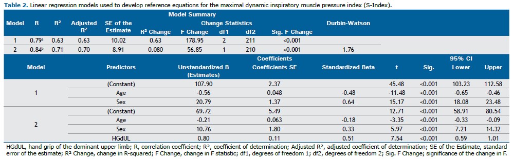 The S-Index and MIP were strongly correlated (rho=0.822; 95%CI: 0.770–0.859; p<0.001), as were the S-Index and HGdUL (rho=0.841; 95%CI: 0.760–0.853; p<0.001). In order to assess the variables influencing the S-Index in healthy adults, multiple linear regression analysis was performed using two models. Model 1 included sex and age as independent variables in all MIP prediction equations, whereas Model 2 included sex, age, and handgrip strength measured in the dominant upper limb (HGdUL) to evaluate the extent to which HGdUL improves the prediction of the S-Index in healthy Brazilian adults.