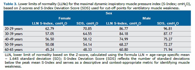 In contrast, our study adopted a different approach. Rather than determining a single cut-off value, we established a minimum expected value (LLN) for each age group and sex, thereby accounting for physiological variations between men and women as well as the age-related decline in respiratory muscle strength consistently reported in previous studies. (1,20) By calculating age- and sex-specific thresholds, our methodology offers a more precise and clinically relevant assessment of ventilatory muscle weakness. It reflects the natural changes associated with aging rather than applying a fixed value across all adult age groups. This approach improves diagnostic accuracy and aligns with the growing body of literature emphasizing the need for age- and sex-adjusted reference values for respiratory muscle strength.