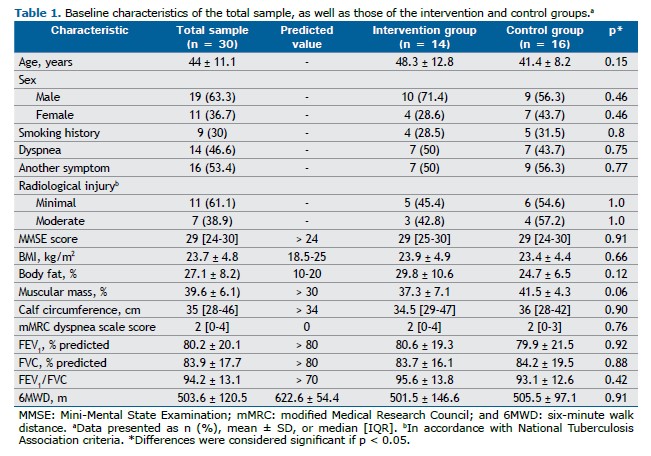 In yet another study,(35) the benefits of a home-based rehabilitation program for this population were assessed in an RCT involving a six-week intervention and 67 participants. The rehabilitation program consisted of low-impact exercises for the arms and legs (wall push-ups, repeated sit-to-stand movements, and calf raises), and participants were encouraged to “walk faster” each day during the walking component of the program. Specific pulmonary exercises included pursed-lip breathing, diaphragmatic breathing, postural correction, and cough facilitation exercises. Exercise tolerance was assessed by the 6MWT, demonstrating a significant improvement in the intervention group in comparison with the control group (p = 0.007; 95% CI, 15.37-92.7),(35) which contrasts with our findings (p = 0.133). This might be due to differences in sample size or in patient engagement and commitment to carrying out the home-based protocol.(35)