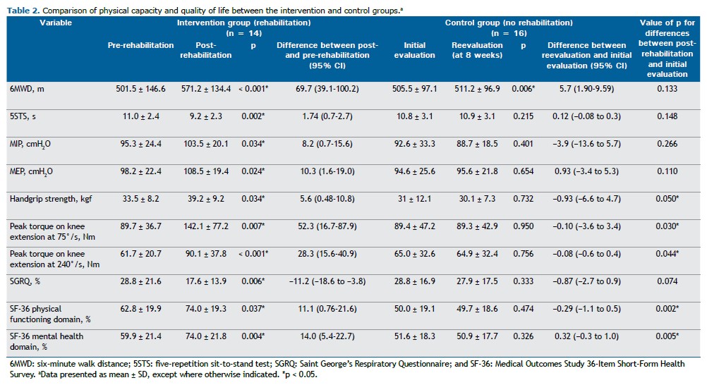 In another study,(33) positive outcomes from a six-week rehabilitation therapy program were demonstrated. The study included 29 patients, of whom 52% were female. The study participants completed a supervised group-based rehabilitation protocol twice per week combined with daily home-based exercise instructions. The supervised rehabilitation program consisted of educational sessions on health topics (including the effects of respiratory diseases, self-care, exercise, and diet), 30 min of walking, and anaerobic exercises for the arms and legs. After six weeks, the group showed a significant reduction in symptoms, improvements in functional tests (including the incremental shuttle walk test and the 5STS), and enhanced QoL (as assessed by the Clinical COPD Questionnaire and the Patient Health Questionnaire-9), which persisted for an additional six weeks after the intervention.(33) Our study did not employ the same instruments for assessing QoL; however, despite the fact that we used a telerehabilitation approach, we observed similar results, with a significant improvement in 5STS performance when comparing the pre- and post-intervention groups.