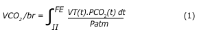 The user interface was developed in the Python programming language, with local storage (computer) of data in CSV files. Flow (L/min) and partial pressure of CO2 (PCO2, in mmHg) were recorded with synchronized timestamps of 10 ms. The volume of CO2 exhaled per cycle (VCO2/br) was calculated by equation 1, as follows: