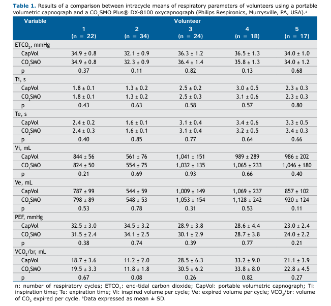 Table 1 shows the comparative results between our portable volumetric capnograph and the reference equipment, with no significant differences between the two (p > 0.05) in any of the parameters analyzed.
