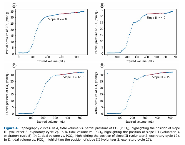 Figures 4A, 4B, 4C, and 4D illustrate examples of capnography curves with the respective positions of slope III, calculated between 40% and 80% of tidal volume(22,23) and showing the intercycle variability characteristic of spontaneous breathing.