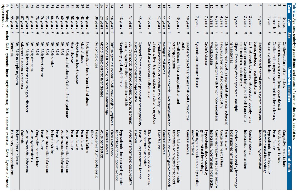 The pediatric group mainly presented with malformations, malignancies, and autoimmune diseases as underlying conditions, and the most common causes of death were cerebral edema and heart failure. The adults and elderly patients had diabetes mellitus and systemic arterial hypertension and died from cardiovascular causes. Table 1 shows the age, sex, underlying conditions, and immediate cause of death of each patient in the study population.