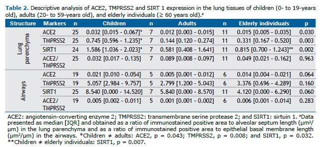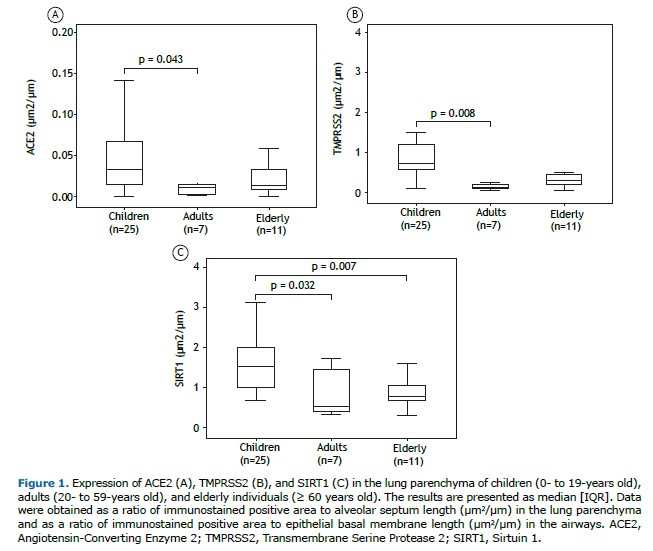 AUTHOR CONTRIBUTIONS ACAL participated in the selection of pediatric samples; analyzed images of samples immunostained for ACE2 and TMPRSS2; assisted in performing the statistical analysis; and drafted the manuscript. FCLF participated in the selection of adult and elderly samples. GRJ analyzed images of samples immunostained for SIRT1. NSXC assisted in sample selection; assisted in performing histological and immunohistochemistry quality control; and performed the standard analysis of the sample images. JMB performed the statistical analysis. LVRFSF conceived the study and was involved in its design and coordination; and drafted and revised the manuscript. TM conceived the study; participated in its design and coordination; performed histological and immunohistochemistry quality control; and drafted and revised the manuscript. All authors reviewed and approved the final manuscript.