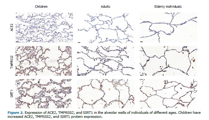 An important protein linked to lung senescence is sirtuin 1 (SIRT1), which is known to be decreased in elderly individuals when compared with adults.(20) SIRT1 is a histone deacetylase(21) that plays a key role in cell survival. SIRT1 stimulates ACE2 transcription and protein expression under conditions of cell energy stress(22) and could participate in the mechanisms leading to distinct ACE2 expression through the lifespan.