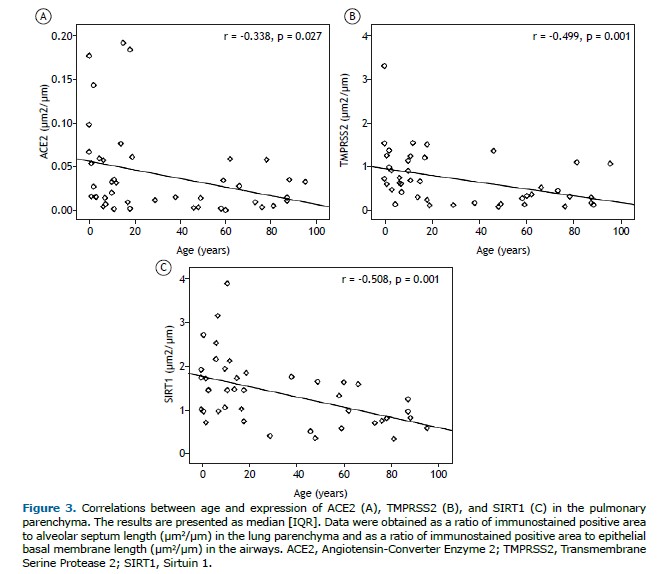 Our study is the first to use a semiautomated quantitative method to analyze these proteins and corroborated findings that not only ACE2 but also TMPRSS2 and SIRT1 are more expressed in the lung parenchyma of children. In older individuals, the lower ACE2 levels, by amplifying angiotensin II action, supports pathological processes such as endothelial dysfunction, thrombosis, deleterious inflammation, oxidative stress, and vasoconstriction.(1) When the SARS-CoV-2 envelope fuses with a cell membrane, the extracellular component of ACE2 is internalized and inactivated, thus downregulating this protein.(24) Although counterintuitive, while acting as a receptor for virus entry, the higher expression of membrane-bound ACE2 in alveolar epithelial cells could also protect against RAS system imbalance,(25) which could contribute to the worsening of lung injury.
