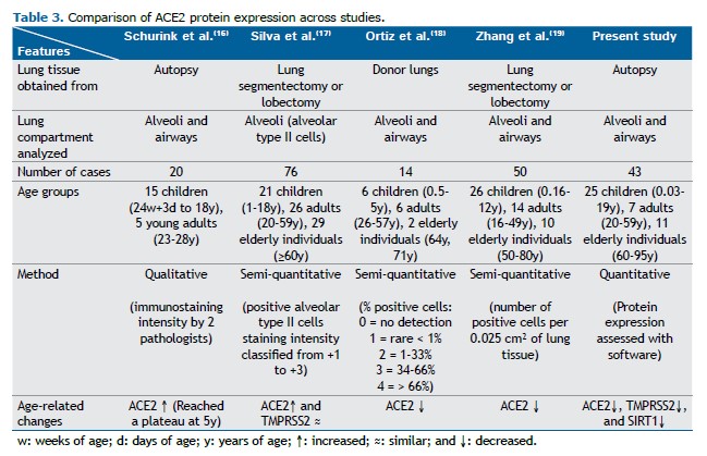 Schurink et al.(16) qualitatively evaluated ACE2 immunostaining intensity in the alveoli and airways of lungs from 15 children (from fetuses to adolescents) and 5 young adults and showed that ACE2 expression was lower in younger children and increased until reaching a plateau at the age of 5 years. Silva et al.(17) analyzed the percentage of ACE2 and TMPRSS2 staining positivity in alveolar type II cells in the lung parenchyma of 21 children, 26 adults, and 29 elderly individuals, classifying the staining intensity from +1 to +3. The study revealed that ACE2 was less expressed in the alveoli of children than in those of adults and elderly individuals, and TMPRSS2 was not different among age groups.(17) In contrast, Ortiz et al.(18) graded the percentage of lung ACE2-positive cells and showed that this protein was more expressed in the lungs of 6 children than in those of 8 adults/elderly patients. Zhang et al.(19) quantified the number of ACE2-positive cells per 0.025 cm2 of lung tissue in 26 children under 12 years of age and 24 adults/elderly individuals. This protein was more expressed in the lungs of children and declined progressively when the samples were grouped as 0-10 years of age, 10-50 years of age, 50-60 years of age, 60-70 years of age, and > 70 years of age, with no difference between the first two groups.(19)