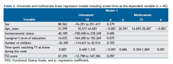 Table 3 presents our linear regression model with ST as the dependent variable. The univariate analysis showed a significant association between ST and age, as well as between ST and time spent watching television at home during the week (p < 0.05). Those associations remained significant in the multivariate analysis.