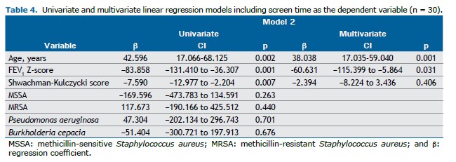 One of the limitations of our study is its cross-sectional design, which does not allow for inferences over time. Another limitation is the self-report nature of the recall diary used to record ST; because this is a subjective measure, it may be underestimated by the observer. In addition, our sample was small because of low hospitalization rates in the pediatric population. Furthermore, ours was a convenience sample, which does not allow generalization of the results for this population. On the other hand, one strength of the present study is its contribution to a better understanding of screen exposure, a highly relevant issue today. We believe that our study can foster reflection and support the development of future measures in hospital settings to guide patients and their families regarding ST. Additionally, our analysis of the association between ST and other important factors affecting the lives of CF patients adds significant value to research.