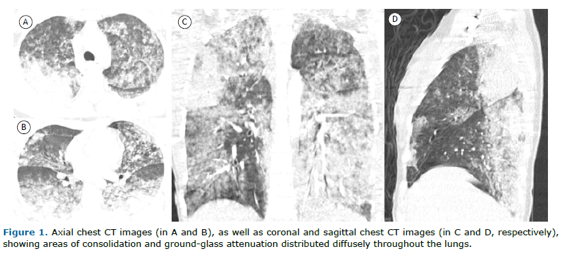 A 17-year-old female inhaled butane from a portable air horn during a party and developed acute respiratory failure immediately after inhalation. She was near a hospital and was treated immediately. She developed respiratory arrest upon arrival and received advanced life support. She was intubated, and pink frothy fluid was suctioned from the endotracheal tube. Her clinical status improved, and she underwent chest CT examination, which showed extensive areas of consolidation and ground-glass attenuation distributed diffusely throughout the lungs (Figure 1). She stayed in the ICU for 9 days and was discharged after recovery.